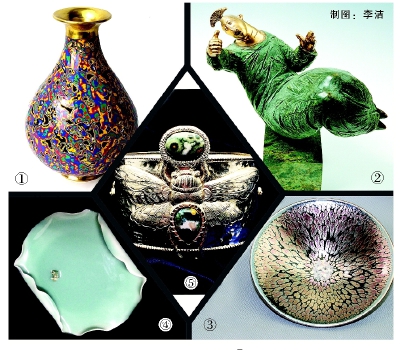 亮相第八屆國際傳統(tǒng)藝術(shù)邀請展的作品:①銅雕技藝代表性傳承人朱炳仁作品。②烏克蘭國寶級藝術(shù)家奧列格·平丘克作品。③建盞燒制技藝新生代工藝師饒飛雄作品。④龍泉青瓷燒制技藝傳承人李震作品。⑤上海工藝美術(shù)學(xué)院青年教師謝白設(shè)計的首飾。(均上海藝術(shù)品博物館供圖)