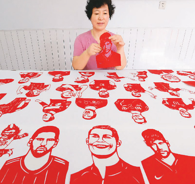日前,河北省邯鄲市民間剪紙藝人馮石萍利用兩周時間,創(chuàng)作出以梅西、C羅、內(nèi)馬爾等球星為原型的剪紙作品,迎接世界杯的到來。