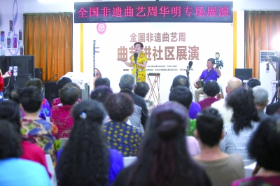 全國非遺曲藝周正在天津如火如荼地進行。6月10日,一支非遺曲藝小分隊走進天津市東麗區(qū)華明文化活動中心,為當?shù)鼐用袼蜕暇实那囇莩觥?/p>