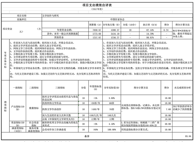 根據(jù)年初設(shè)定的績效目標(biāo),“文學(xué)創(chuàng)作與研究”項(xiàng)目自評(píng)得分為93.84分。產(chǎn)出效益:組織了多批作家深入生活、兒童文學(xué)獎(jiǎng)評(píng)獎(jiǎng)、文學(xué)作品扶持、發(fā)展了少數(shù)民族文學(xué)創(chuàng)作,進(jìn)行文學(xué)評(píng)論的創(chuàng)新與研究。發(fā)現(xiàn)的主要問題及原因:一是年初設(shè)置的個(gè)別指標(biāo)不合理;二是部分二級(jí)項(xiàng)目執(zhí)行進(jìn)度較慢。下一步改進(jìn)措施:增強(qiáng)指標(biāo)設(shè)置的科學(xué)性,加快預(yù)算執(zhí)行進(jìn)度,提升文學(xué)工作的開拓性與創(chuàng)新性。