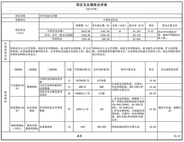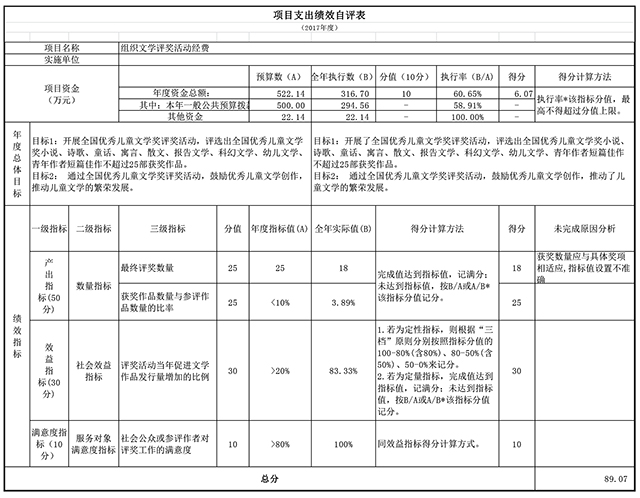 經(jīng)我單位自評(píng),“組織文學(xué)評(píng)獎(jiǎng)”項(xiàng)目績效得分為89.07分。