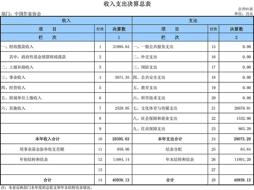 中國作協(xié)2017年度收入總計(jì)40939.13萬元,支出總計(jì)40939.13萬元。與2016年相比,收、支總計(jì)各增加3983.56萬元,同比增長10.78%。