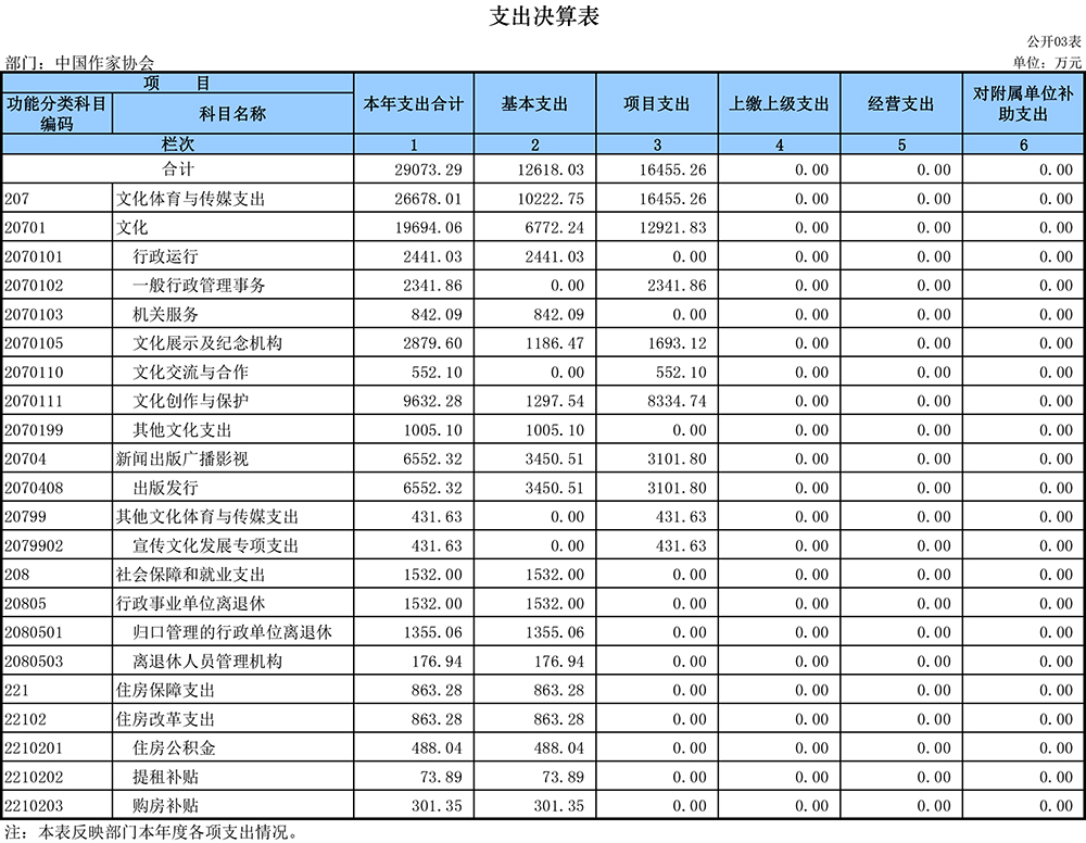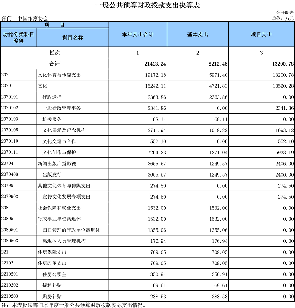 八、文化體育與傳媒(類)文化(款)一般行政管理事務(wù)(項(xiàng)):指中國作協(xié)本級(jí)組織作家深入生活等各項(xiàng)支出。