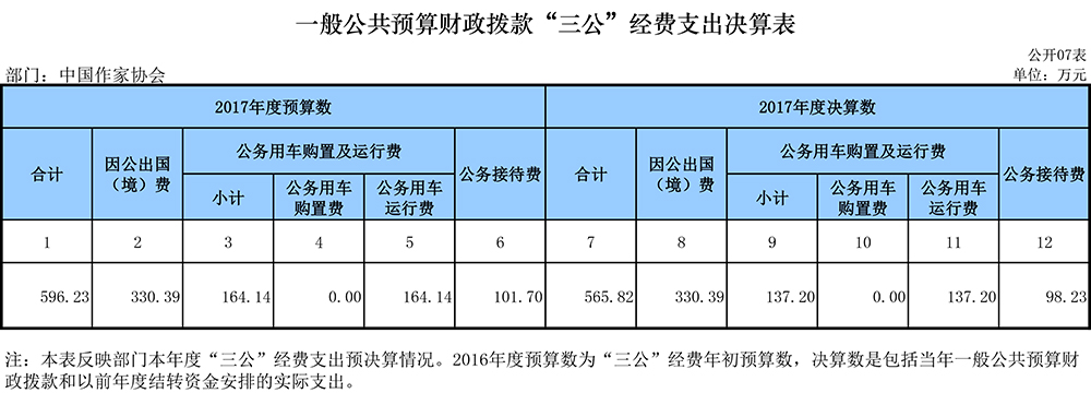 中國作協(xié)2017年財(cái)政撥款“三公”經(jīng)費(fèi)支出預(yù)算為596.23萬元,其中:因公出國(境)費(fèi)330.39萬元,公務(wù)用車運(yùn)行費(fèi)164.14萬元,公務(wù)接待費(fèi)101.70萬元。