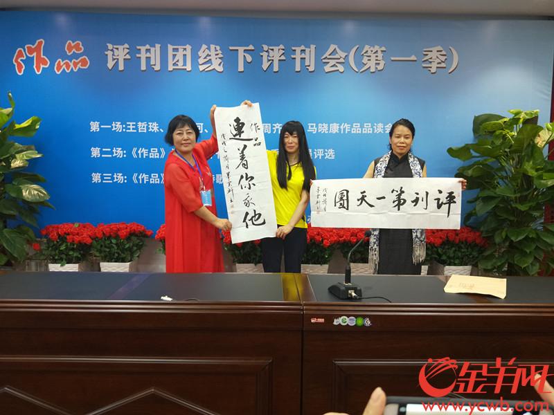 《作品》評刊團(tuán)代表向《作品》雜志社贈(zèng)送書法作品。