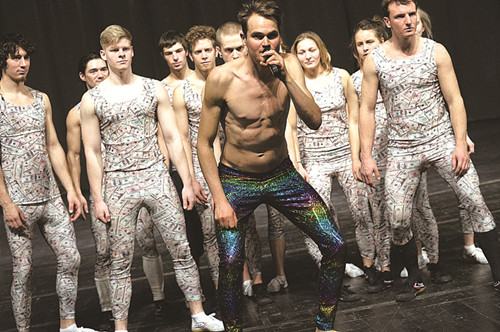 過多的論述性獨白,讓這部作品看起來更像是一篇探討當今網絡時代資本主義個體與群體關系的社會學論文。劇中,波列許以布萊希特關于個體與集體的思考為基點,輻射出了對個體與網絡、個體與媒介關系的現代追問,引出了人們是否還愿意為愛而殉情、網絡時代人的信用何在等話題,甚至還插入了馬克思、???、讓-呂克·南希等人的觀點“以身說法”,以增加作品的理論性和說服力。波列許追求建立在深刻基礎上的批判,但他的講述過程深入淺出、表現手段日常而淺顯,他善于將自己的論點分散在舞臺演出的不同節(jié)點上,以流行元素、時尚媒介、視聽沖擊加以偽裝,讓觀眾輕而易舉地進入他的舞臺世界,這正是波列許戲劇創(chuàng)作的高明之處。比如,添加趕時髦樂隊的音樂,以此表現當代人激情的缺失,沒有人愿意再為愛情而赴湯蹈火了;播放邁克爾·杰克遜的演出視頻,以此來諷刺標榜虛偽個性的人,其實就是消解自我的一味模仿;“資本主義合唱團”跳起了《大河之舞》,暗示著流行文化帶來的千篇一律,實際上背后沒有實在的東西;在搖滾歌手莫里西《人生是一個豬圈》的音樂中,舞臺成為旋轉的游樂場,合唱團的成員們在雨中肆意狂歡,毫無底線地放縱著自己,而此時的法茨獨自拉著大篷車,逆時針地艱難前行,這段對“大膽媽媽”的戲仿,表達的既是一種逃離的行為,更是一種堅持個性的生存選擇與態(tài)度,只是最終,他失敗了。