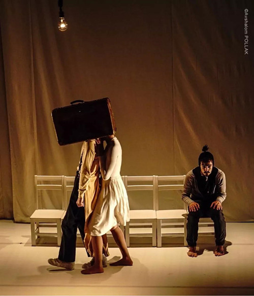 舞臺上那只昏暗的白熾燈下,行將就木的老先生肩扛一只陳舊的皮箱;與面對的三位男舞者,以體姿、神態(tài)和裝束顯示出青、中、老年不同的年齡感;一排規(guī)整擺放的白色椅子,似是走過的路,靜靜地鋪展在那里。
