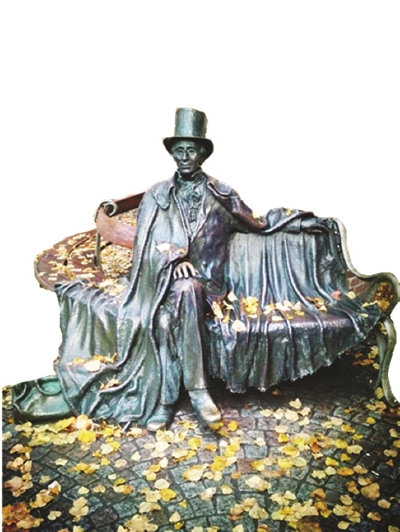 我住的安徒生麗笙酒店,門口有棵高大的銀杏,座椅繞樹圍成半圓,安徒生坐像占了三分之一。安徒生肩頭的大披風(fēng)右邊拖地,左邊遮蓋了椅子足有兩人的位置,腳邊的地下放著手提包。秋深了,金黃的杏葉散落一地,有些落在了安徒生的披風(fēng)上。