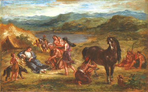 不過,德拉克瓦并不那么贊同庫爾貝反映社會現(xiàn)實的“活力藝術(shù)”觀,而更醉心于歷史傳說??履贰た柌紡娬{(diào):“德拉克瓦早在馬賽爾·普魯斯特之前,就在他的《日記》中表達了一種奇特的思想,即‘回憶與創(chuàng)作的平衡機理’,按照每一個體固有之模式,通過無意識記憶來實現(xiàn)視覺、味覺和感覺必要的融合。在他看來,憑回憶作畫乃是連接所有繪圖成分,保持整體和諧最可靠的方式。將現(xiàn)實的因素與其他文學,或更久遠的創(chuàng)造果實相配合,定能保持其藝術(shù)特性?!笨履贰た柌加终f,德拉克瓦受時代感應,在《奧維德隱居斯基泰人部落》一畫中繪出了藍霧繚繞的山崗和密遐的遠方,仿佛進入勝境,寄托藝術(shù)家的奇異思索。德拉克瓦畫古羅馬詩人、《變形記》作者奧維德立在一匹紫騮雌馬旁邊深思,好似自己晚年仍在考量中探求“回憶機理”的畫面。