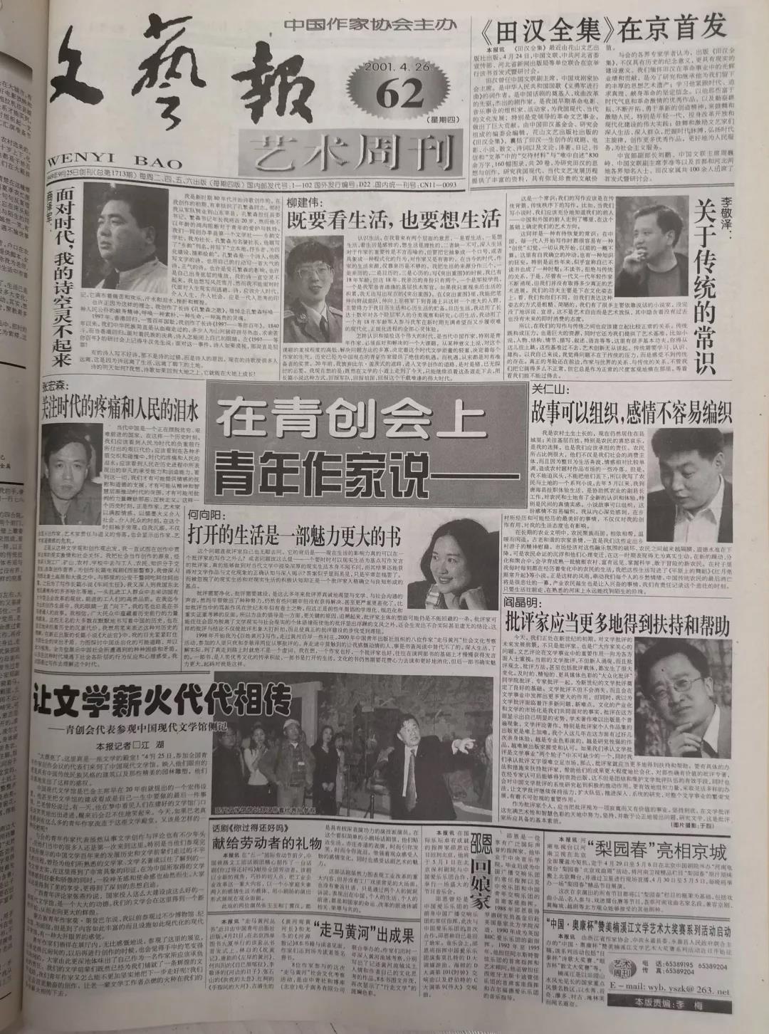 2001年4月23日至26日,230余位來自全國的青年作家又一次聚到了北京,參加由中國作協(xié)、共青團(tuán)中央聯(lián)合召開的全國青年作家創(chuàng)作會議。中共中央政治局委員、中央書記處書記、中宣部部長丁關(guān)根出席會議并講話,向青年作家提出希望。中國作協(xié)黨組書記、副主席金炳華在閉幕式上作了題為《讓新世紀(jì)的文學(xué)星空更加燦爛》的講話。團(tuán)中央書記處第一書記周強(qiáng)在閉幕式上講話。