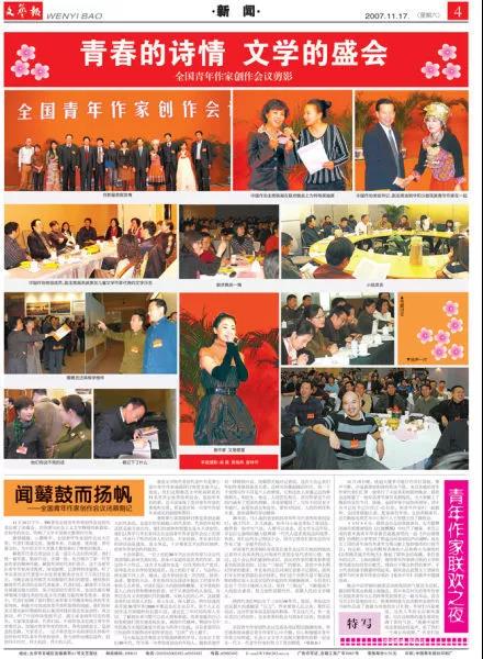 2007年11月13日至16日,由中國作協(xié)和共青團(tuán)中央聯(lián)合召開的全國青年作家創(chuàng)作會議在京舉行。300多名青年作家代表和特邀作家代表參加會議。中共中央政治局常委李長春出席會議并講話。中共中央政治局委員、中央書記處書記、中宣部部長劉云山出席會議。中國作協(xié)主席鐵凝致開幕詞。團(tuán)中央書記處第一書記胡春華在開幕式上致祝詞。中國作協(xié)黨組書記、副主席金炳華作了題為《新世紀(jì)中國文學(xué)的青春遠(yuǎn)航》的報告。中國作協(xié)副主席高洪波作了會議總結(jié)。
