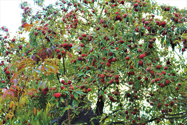 我跟著他往西邊走,約兩公里后,一座扁形的大山突然橫亙在眼前?!翱矗墙须u素子!”李老抬手指指山腰,又指指山麓的左右兩側(cè)。我一一望去,見每一處都是“萬綠叢中一點紅”,真真切切,非常養(yǎng)眼。山麓左側(cè)的不遠(yuǎn)處,我們走近看,見是一棵斜長在石縫里的彎樹,高約4米,叉枝又生叉枝,枝條密匝,其上綴著大小形狀均如荔枝的果兒,無以計數(shù),紅紅火火,令人心曠神怡。