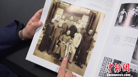 尚長榮向中新網記者介紹舊相片中的人物。 康玉湛 攝