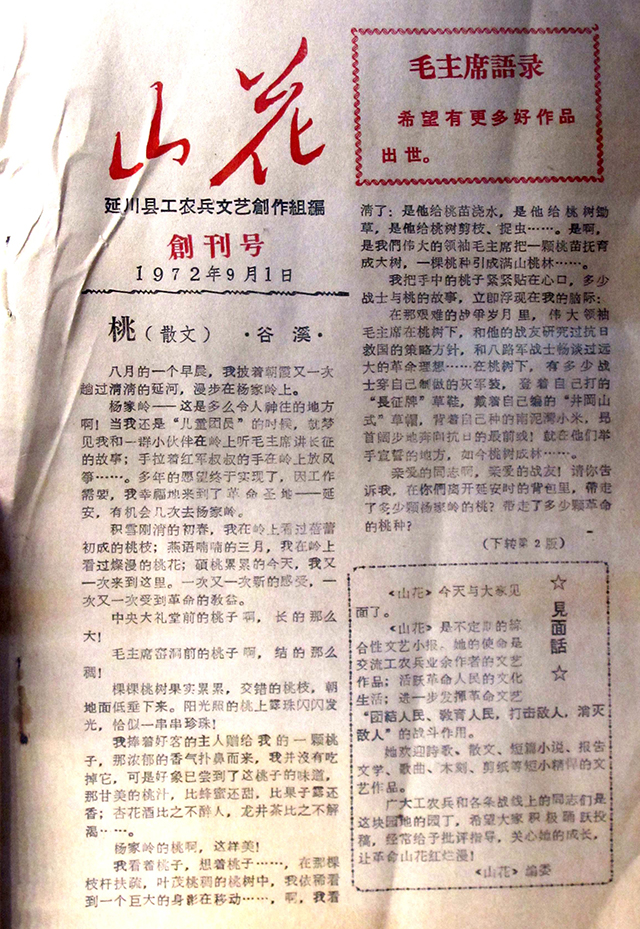 《山花》是由陜北著名詩人曹谷溪、已故著名作家路遙等人于1972年創(chuàng)辦的一張地方文藝小報。