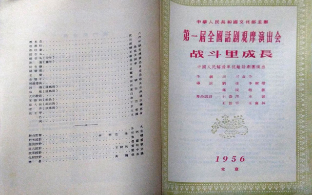 文代會期間,還舉行了規(guī)模較大的文藝展演,使我們看到了兄弟單位演出的戲。那時印象深刻的有,陳其通編劇的五幕話劇《炮彈是怎樣造成的》、李之華編劇的獨幕話劇《反“翻把”斗爭》、魏風(fēng)編劇的《劉胡蘭》等。我是搞創(chuàng)作的,感覺自己落后了,受到激勵,我發(fā)誓絕不提待遇、絕不提要求,發(fā)奮搞創(chuàng)作。