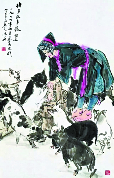 另一位涉獵生肖豬的書(shū)畫(huà)名家當(dāng)推黃胄。他素以畫(huà)驢聞名于世,不過(guò),這并不妨礙他對(duì)其他小動(dòng)物也頗有興致。與徐悲鴻、齊白石畫(huà)豬很多時(shí)候系應(yīng)邀而作不同,黃胄并非客串,而是主動(dòng)為之。他特別喜愛(ài)動(dòng)物,尤其是與人類接觸親密者,其筆下的豬,圓滾可愛(ài),又變化多端,或閑庭信步,或奮力疾行,可謂千豬千面。值得一提的是,他還留下不少“牧豬圖”,畫(huà)中婀娜多姿的女子與靈動(dòng)?jì)珊┑呢i仔相映成趣,通過(guò)表現(xiàn)人類與動(dòng)物和諧共處,贊美生命之美和勞動(dòng)之美,極富感染力。