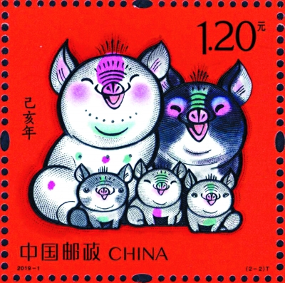 郵票第一圖為“肥豬旺?!?,肥豬肚藏乾坤,憨態(tài)可掬,以奔跑的動態(tài)表現(xiàn)靈動生風(fēng)的喜感,象征著正在奔向美好的生活;第二圖為“五福齊聚”,是首次在一枚生肖郵票中完整體現(xiàn)“全家?!钡母拍睿瑑芍淮筘i和三只小豬同時出鏡,其樂融融,寄托新春佳節(jié)合家團(tuán)圓、五福臨門的美好祝福。