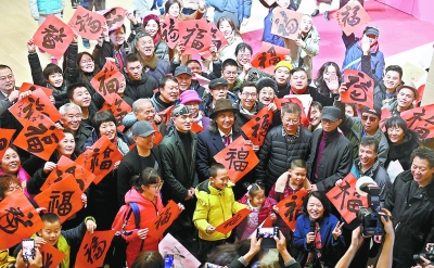 現(xiàn)場送“?!被顒映掷m(xù)了一個小時,就在領到福字的觀眾意猶未盡之時,中國美術館的工作人員告訴大家,北京晚報的記者還要給大家拍攝一張“全家?!薄S^眾們很快將吳為山館長、燕東升書記和藝術家們簇擁在一起,高舉起手中的福字,記者爬上二樓的走廊處,按下快門,拍下了這喜慶的時刻。