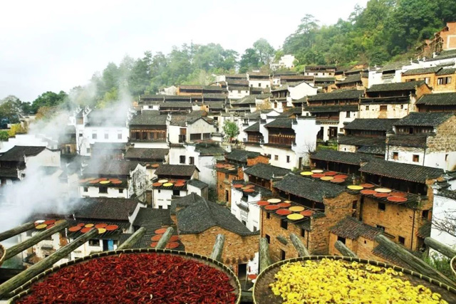 2018年9月12日,安徽黃山呈坎古村村民在曬場上晾曬辣椒、玉米等各類農(nóng)作物。