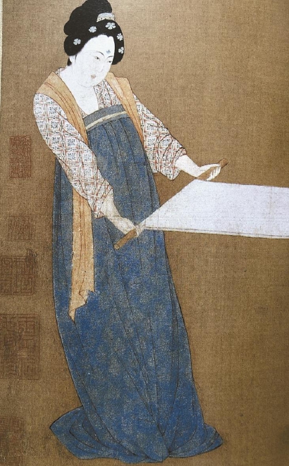 張萱和周昉是唐代仕女畫(huà)最重要的代表人物。《宣和畫(huà)譜》稱(chēng)張萱“于貴公子與閨房之秀最工”,善于描繪曲眉豐頰、“朱暈耳根”的仕女形象。張萱的原作今已無(wú)存,史上留下兩件重要的摹本,即傳說(shuō)是宋徽宗臨摹的《虢國(guó)夫人游春圖》卷和《搗練圖》卷。其中《搗練圖》卷現(xiàn)藏于美國(guó)波士頓美術(shù)博物館,表現(xiàn)的是貴族婦女搗練縫衣的工作場(chǎng)面,按勞動(dòng)工序分成搗練、織線、熨燙三組。只見(jiàn)宮女們身著低領(lǐng)窄袖短襦,系高腰長(zhǎng)裙并扎絲帶,身披輕薄如紗的印繡紋樣披帛,舉止嫻雅,意態(tài)從容。