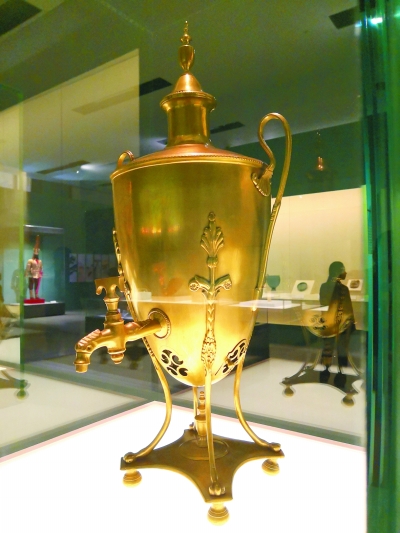 隨著茶葉進入俄羅斯,一些重要的飲茶習俗也隨之出現(xiàn)。請看這兩只俄羅斯的茶壺,與中國傳統(tǒng)概念中的茶壺相比,實在可謂“巨大”,而且樣子也不同。注意到了嗎?它們的下端都有一個籠頭,與咱們常見的飲水機相似。俄羅斯人就是在這種特殊的茶壺中用開水沖泡茶葉。