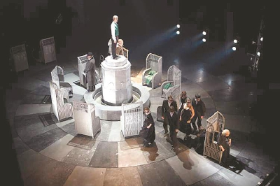 福金:小說《賭徒》吸引我的地方在于,主角面對人生的選擇,就像面對賭場里的輪盤賭。我把舞臺設(shè)計成一個轉(zhuǎn)動的賭盤,舞臺不停轉(zhuǎn)動,指針隨機(jī)地指向零或其他數(shù)字,這象征著男主角阿列克謝的處境——他絕望地愛著將軍的養(yǎng)女波琳娜,卻沒有勇氣追求愛情;他被困在那座以溫泉和賭場出名的度假小城,無法選擇自己未來的道路,他的人生成為一場“押對”和“押錯”之間的游戲。每一個出現(xiàn)在舞臺上的角色都會被賭盤推著走,輪盤賭的游戲吞噬了每一個人——阿列克謝、將軍、老太太……他們的生活陷入了各種各樣的障礙,有經(jīng)濟(jì)的,也有感情的,這群人無法面對現(xiàn)實(shí)的障礙,用賭徒的心態(tài)迎接未知的命運(yùn)。