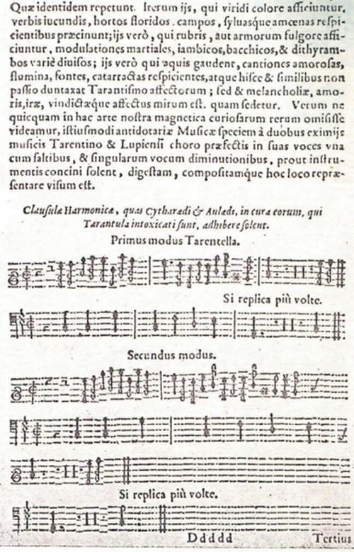 舞蹈和音樂是治療由塔蘭托毒蛛叮咬所致的瘋狂病的唯一有效藥物,但也不是任何的音樂和舞蹈都有效,只有在阿普利亞演奏了數(shù)百年的這種傳統(tǒng)音樂曲調(diào)才有效,要是沒有這舞蹈和音樂,病人會在幾小時或者幾天內(nèi)死去。就這樣,他們常常太陽一升起就開始跳,持續(xù)不斷地跳到午前十一時。但也有些人會在中途停下,這并非是因?yàn)樘眠^于疲憊不堪才不得不休息,而是因?yàn)榘l(fā)現(xiàn)舞蹈的節(jié)拍跟不上曲調(diào)。如此這般,大約跳到正午,他們才停息下來,躺到床上去盡情出汗,然后擦干身上的汗,喝點(diǎn)兒肉湯補(bǔ)充營養(yǎng)。大約下午一點(diǎn),最遲兩點(diǎn),舞樂又開始了,人們一直跳到晚上。這樣一連數(shù)日,病人精疲力竭了,病也就暫時治好了。據(jù)說有一些人,大部分是陷入愛情之中或者感到孤獨(dú)寂寞的人,為了加入跳舞的行列,甚至假裝發(fā)病。這些人大多是戀愛中的女子和單身漢,希望在這舞蹈意淫中獲得性的滿足。