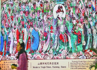參觀者從文博會(huì)現(xiàn)場(chǎng)展示的山西芮城永樂(lè)宮壁畫(huà)動(dòng)畫(huà)前走過(guò)。新華社記者 毛思倩攝