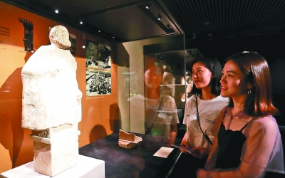 觀眾在清華大學(xué)藝術(shù)博物館參觀阿富汗國家寶藏展上展出的“赫爾墨斯方形石柱”。新華社發(fā)