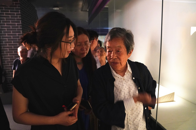 舒濟(jì)(右)參觀展覽,中國(guó)現(xiàn)代文學(xué)館征集編目部王雪博士(左)進(jìn)行講解