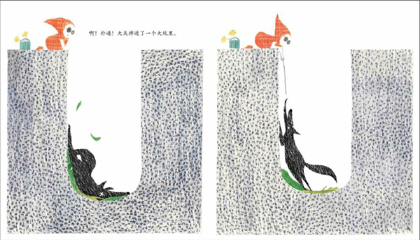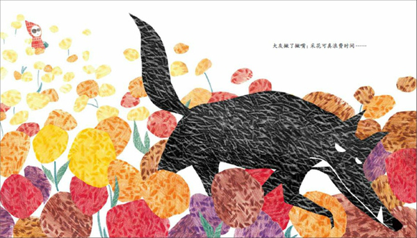 澎湃新聞:王曉明老師給《小紅帽》寫(xiě)的導(dǎo)讀里提到,在這本書(shū)的封底,我們以為已經(jīng)被小紅帽感化的大灰狼,決絕地丟棄了小紅帽給它包扎傷口的衣角,他認(rèn)為這體現(xiàn)了圖文之間“一個(gè)故事各自表述”的意圖,對(duì)此,能不能談?wù)勀阕约旱目捶ǎ?/p>