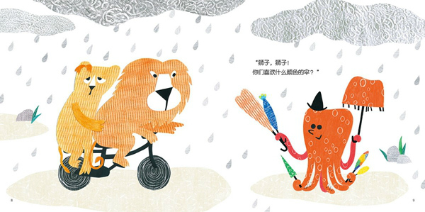 韓煦:您的問(wèn)題很細(xì)致。在拼貼拓印技法的基礎(chǔ)上,我會(huì)針對(duì)自己的每件作品尋找最合適的表達(dá)方式。《走出森林的小紅帽》用到許多粗頭的彩鉛,拓印出來(lái)的肌理會(huì)有顆粒感,而《章魚(yú)先生賣(mài)雨傘》用的都是細(xì)頭彩鉛,相對(duì)柔和一些。除此之外,兩個(gè)作品的拓印還有一點(diǎn)區(qū)別,《小紅帽》里的一些形象的顏色是有過(guò)渡的,比如刺猬,我用了深棕淺棕兩種顏色,而《章魚(yú)先生》里的所有圖形元素都是平涂。這些手法上的調(diào)整都是與作品的內(nèi)容、設(shè)定的目標(biāo)讀者群和我想傳達(dá)的情緒有關(guān)。