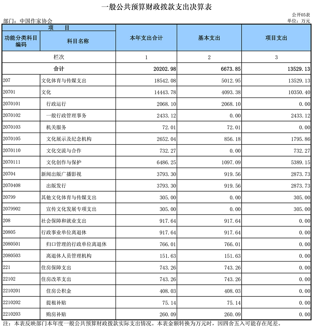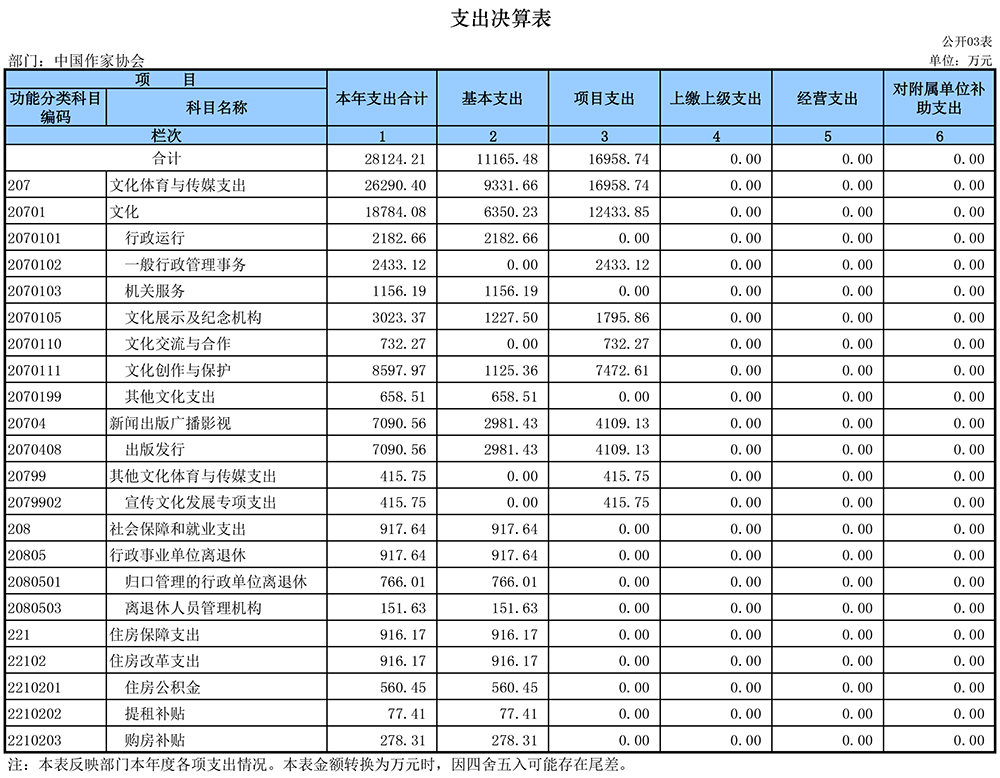 八、文化體育與傳媒(類)文化(款)一般行政管理事務(wù)(項(xiàng)):指中國作協(xié)本級(jí)組織作家深入生活等各項(xiàng)支出。