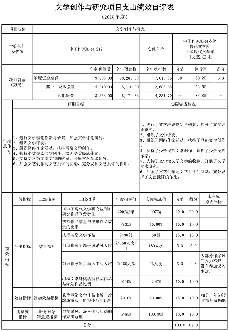 我會(huì)2018年在中央部門決算中反映“文學(xué)創(chuàng)作與研究”和“文學(xué)出版與傳播”兩個(gè)一級(jí)項(xiàng)目績效評(píng)價(jià)結(jié)果。