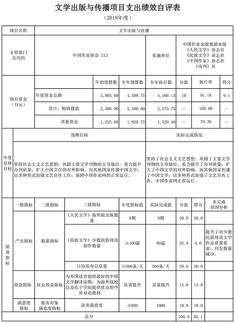 2.“文學(xué)出版與傳播項(xiàng)目”績效自評(píng)綜述:根據(jù)年初設(shè)定的績效目標(biāo),項(xiàng)目自評(píng)得分為82.1分。項(xiàng)目全年預(yù)算數(shù)4,509.75萬元,執(zhí)行數(shù)為4,109.13萬元,完成預(yù)算的91.1%。項(xiàng)目績效目標(biāo)完成情況:堅(jiān)持了社會(huì)主義文藝思想;鞏固了主要文學(xué)刊物的主導(dǎo)地位,著力提升了辦刊質(zhì)量;擴(kuò)大了中國文學(xué)的對(duì)外影響,向其他國家傳播了中國文學(xué);以多種形式加強(qiáng)了文藝宣傳工作;中國作家網(wǎng)正常運(yùn)行。發(fā)現(xiàn)的主要問題及原因:一是部分績效指標(biāo)設(shè)置不科學(xué),不利于績效評(píng)價(jià)和實(shí)際工作的開展,執(zhí)行過程中完成難度較大;二是文學(xué)刊物的發(fā)行需要進(jìn)一步提高。下一步改進(jìn)措施:根據(jù)項(xiàng)目目標(biāo)要求和實(shí)際工作開展情況,合理設(shè)置績效指標(biāo),著力突出文學(xué)刊物的受眾面和影響力。