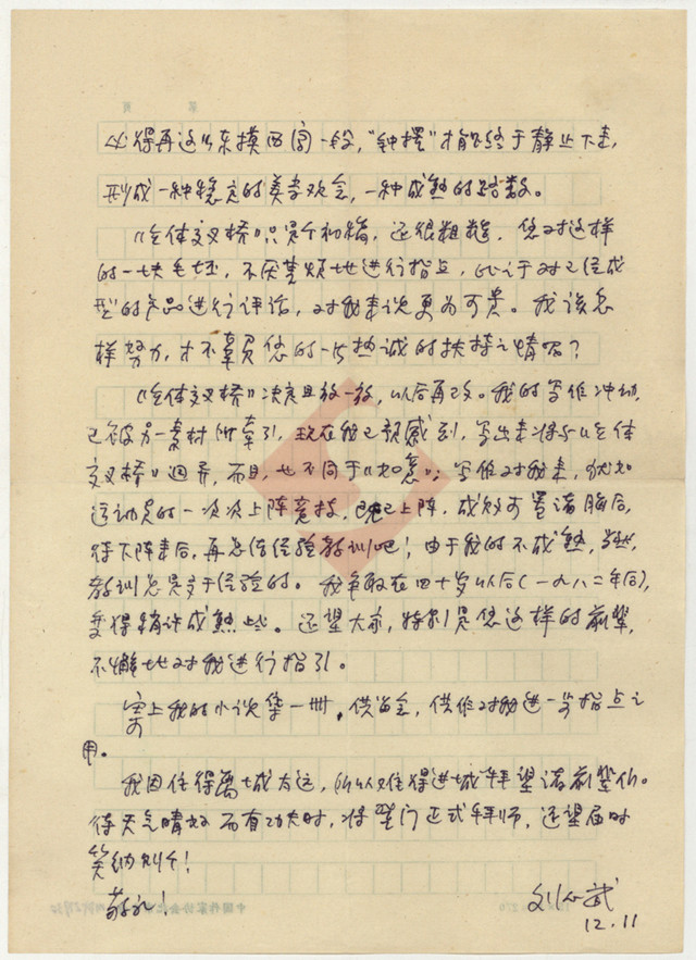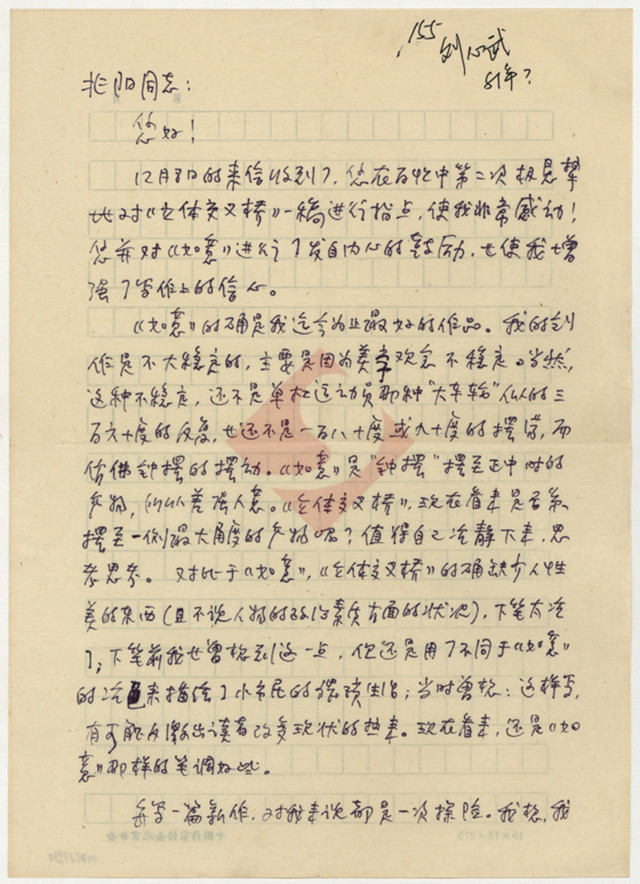 這封書信落款處沒有具體的年份,但我們從內(nèi)容上不難推斷出時間。如信上所言,《如意》(1980年2月寫畢)已經(jīng)完稿并發(fā)表,而《立體交叉橋》(1980年10月寫畢)是初稿未發(fā)表,結(jié)合兩部作品的創(chuàng)作時間和發(fā)表年份來推斷,這封信應(yīng)該寫于1980年12月11日。至于信中提到的“另一素材”應(yīng)該是緊接著于1981年1月創(chuàng)作完成的《大眼貓》。