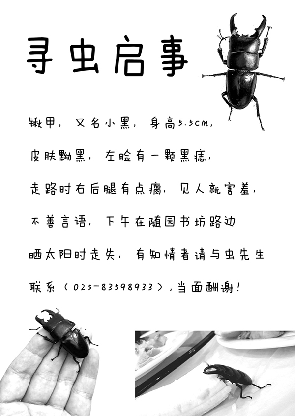 在陌生人那,朱贏椿或許是一個(gè)“怪人”。他小時(shí)候幻想自己騎著螳螂、蜘蛛在小伙伴中大搖大擺,長(zhǎng)大后就用畫(huà)筆給蟲(chóng)子們做了時(shí)裝發(fā)布會(huì);他養(yǎng)的蟲(chóng)子“小黑”不見(jiàn)了,他就在校園里貼了個(gè)《尋蟲(chóng)啟示》;他發(fā)現(xiàn)一只蒼蠅撞窗戶死了,號(hào)召朋友圈里200人給這只蒼蠅寫(xiě)挽聯(lián),還立了一個(gè)“蒼蠅之墓”……