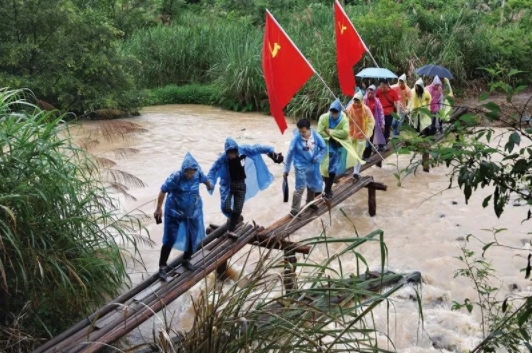 2019年6月11日至8月18日,中央宣傳部組織開(kāi)展了“壯麗70年·奮斗新時(shí)代——記者再走長(zhǎng)征路”主題采訪活動(dòng),先后有1300余名記者追隨當(dāng)年紅軍長(zhǎng)征步伐,深入實(shí)地采訪,累計(jì)跨越16000余公里,推出10000余篇鮮活生動(dòng)、形式多樣的報(bào)道,網(wǎng)上總閱讀量近20億次。習(xí)近平總書(shū)記近日對(duì)“記者再走長(zhǎng)征路”主題采訪活動(dòng)作出重要指示強(qiáng)調(diào),中央宣傳部組織開(kāi)展的“記者再走長(zhǎng)征路”主題采訪活動(dòng),生動(dòng)再現(xiàn)壯懷激烈、驚天動(dòng)地的革命故事,對(duì)闡釋用生命和鮮血鑄就的偉大長(zhǎng)征精神很有意義。圖為6月13日,參加主題采訪活動(dòng)的記者們,在江西于都縣祁祿山沿著當(dāng)年中央紅軍長(zhǎng)征走過(guò)的“紅軍小道”冒雨行進(jìn),體驗(yàn)紅軍穿越深山峽谷的艱苦行程。經(jīng)濟(jì)日?qǐng)?bào)記者 劉興/攝