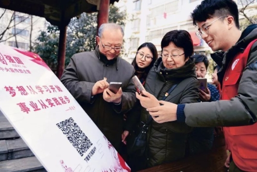 建設(shè)“學(xué)習(xí)強(qiáng)國(guó)”學(xué)習(xí)平臺(tái),是貫徹落實(shí)習(xí)近平總書(shū)記關(guān)于加強(qiáng)學(xué)習(xí)、建設(shè)學(xué)習(xí)大國(guó)重要指示精神、推動(dòng)全黨大學(xué)習(xí)的有力抓手,是新形勢(shì)下強(qiáng)化理論武裝和思想教育的創(chuàng)新探索,是推動(dòng)習(xí)近平新時(shí)代中國(guó)特色社會(huì)主義思想學(xué)習(xí)宣傳貫徹不斷深入的重要舉措。該平臺(tái)自2019年1月1日上線以來(lái),極大地滿足了互聯(lián)網(wǎng)條件下廣大黨員干部和人民群眾多樣化、自主化、便捷化的學(xué)習(xí)需求。圖為2019年2月25日,江蘇科技大學(xué)志愿者在指導(dǎo)老黨員掃描二維碼安裝“學(xué)習(xí)強(qiáng)國(guó)”手機(jī)APP。人民圖片供圖 石玉成/攝