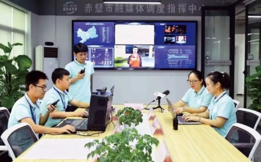 做好新時(shí)代宣傳思想文化工作,重點(diǎn)在基層,關(guān)鍵在創(chuàng)新。建設(shè)縣級(jí)融媒體中心,是打通基層宣傳思想文化工作到達(dá)群眾“最后一公里”的重要探索。圖為2019年5月19日,湖北赤壁市組織開(kāi)展“新時(shí)代文明實(shí)踐 你我同行”活動(dòng),“云上赤壁”全程手機(jī)直播,赤壁市融媒體指揮調(diào)度中心對(duì)直播活動(dòng)進(jìn)行調(diào)度指揮。黃富清/攝