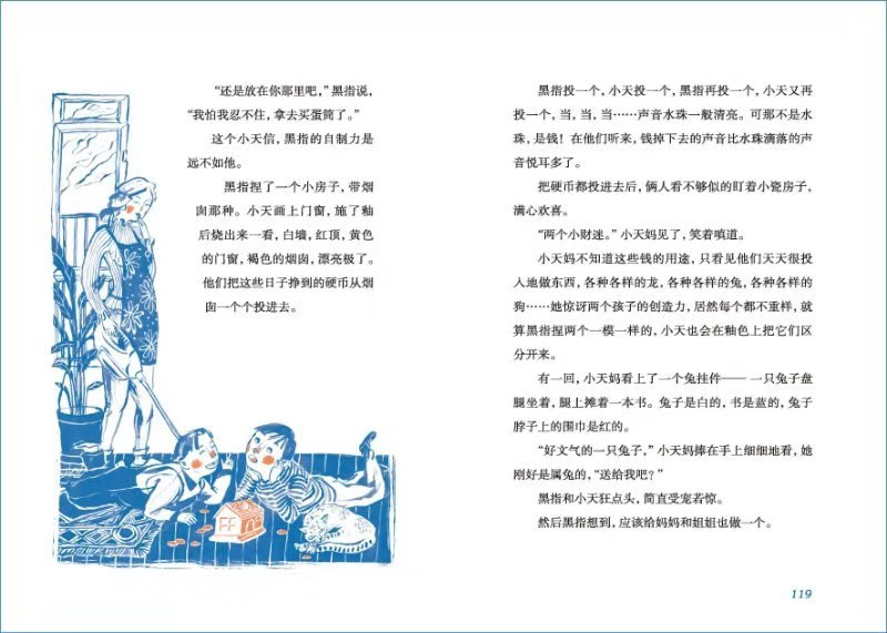 彭學(xué)軍在創(chuàng)作中一直沒有回避一些傳統(tǒng)意義上被認為不適合展現(xiàn)給兒童的東西,比如說死亡,在“男孩不哭”系列的《浮橋邊的湯木》里,黑子與珠兒兄妹的爸爸久病不愈去世,在《森林里的小火車》中,熱愛鐵路的父親和他不敢碰觸的小火車背后裹挾著曾短暫存在過的“姐姐”死亡的可怕陰影。而在《黑指》里,不僅有死亡,還有成人世界的復(fù)雜,被小天爸爸踹倒跌在瓷片上的人,小天對于爸爸的過去與現(xiàn)在的糾結(jié),黑指爸爸的“逃離”,媽媽面臨的下崗,金毛領(lǐng)著鎮(zhèn)上的孩子們做下河撈瓷片的生意,這些世界的“陰暗”和“復(fù)雜”,彭學(xué)軍沒有回避。