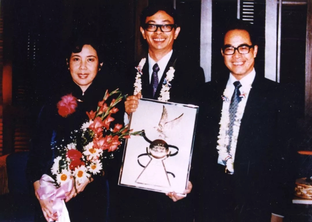 1983年3月,吳貽弓和石方禹(右)、鄭振瑤(左)于馬尼拉,《城南舊事》在第二屆馬尼拉國際電影節(jié)上獲獎后合影