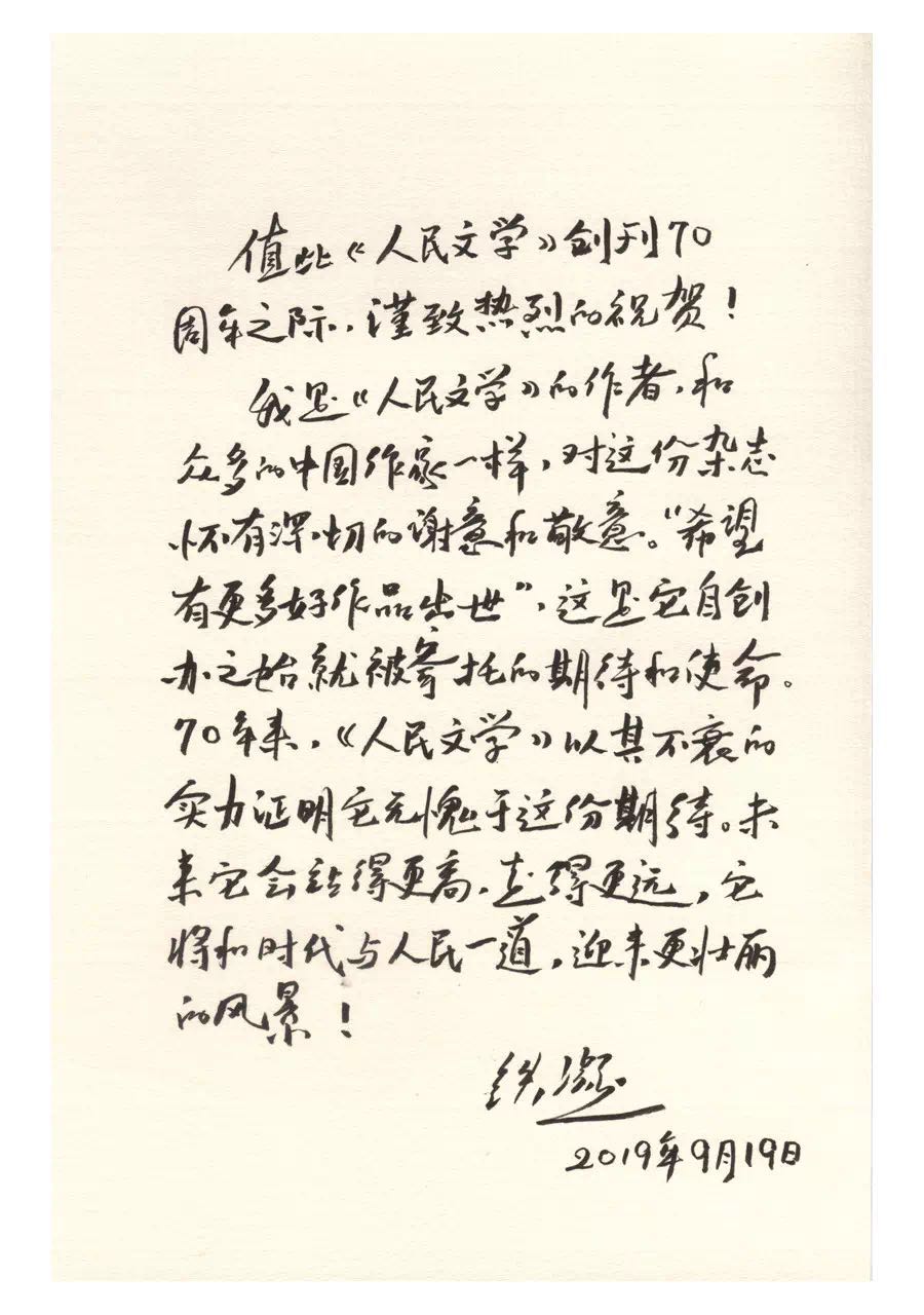 鐵凝致信祝賀《人民文學(xué)》創(chuàng)刊70周年
