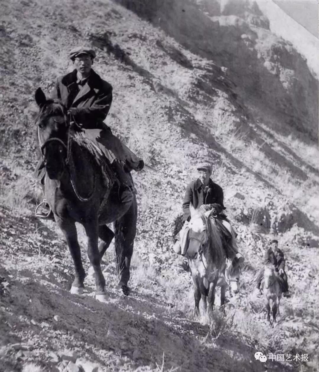 1964年,《瑪納斯》調(diào)查采錄組成員陶陽(左)、劉發(fā)?。ㄖ校②w潛德(右)在騎馬前往新疆阿合奇縣的路上