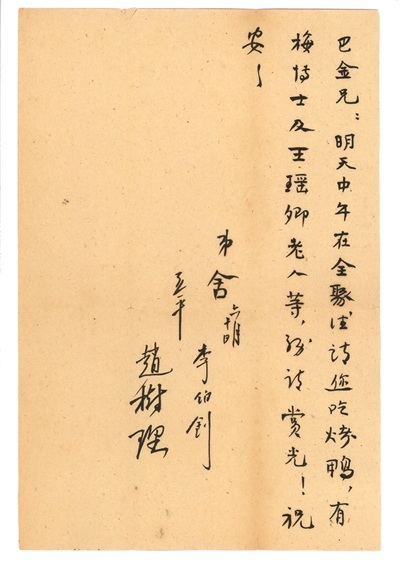 兩張老舍邀請巴金吃飯的便條