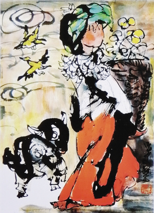 畫面上,三三兩兩的少數(shù)民族姑娘在悠閑地玩耍,身邊圍繞著水牛、山羊和兔子。姑娘們頭上隨意插著大山里的野花野草,密林深處那些不知名的鳥兒、色彩斑斕的蝴蝶、大大小小的野蜂或站在她們的肩膀上,或飛在空中……畫作中大寫意的技法、老到的筆觸、大膽的用色、夸張的舞姿、天馬行空的構(gòu)圖,充滿視覺沖擊力。尤其是那些以山花野草為霓裳,以山羊、野禽為伙伴的大山姑娘,個(gè)個(gè)沒畫眼睛,即便是一筆掠過,也頂多勉強(qiáng)算是閉著眼睛。