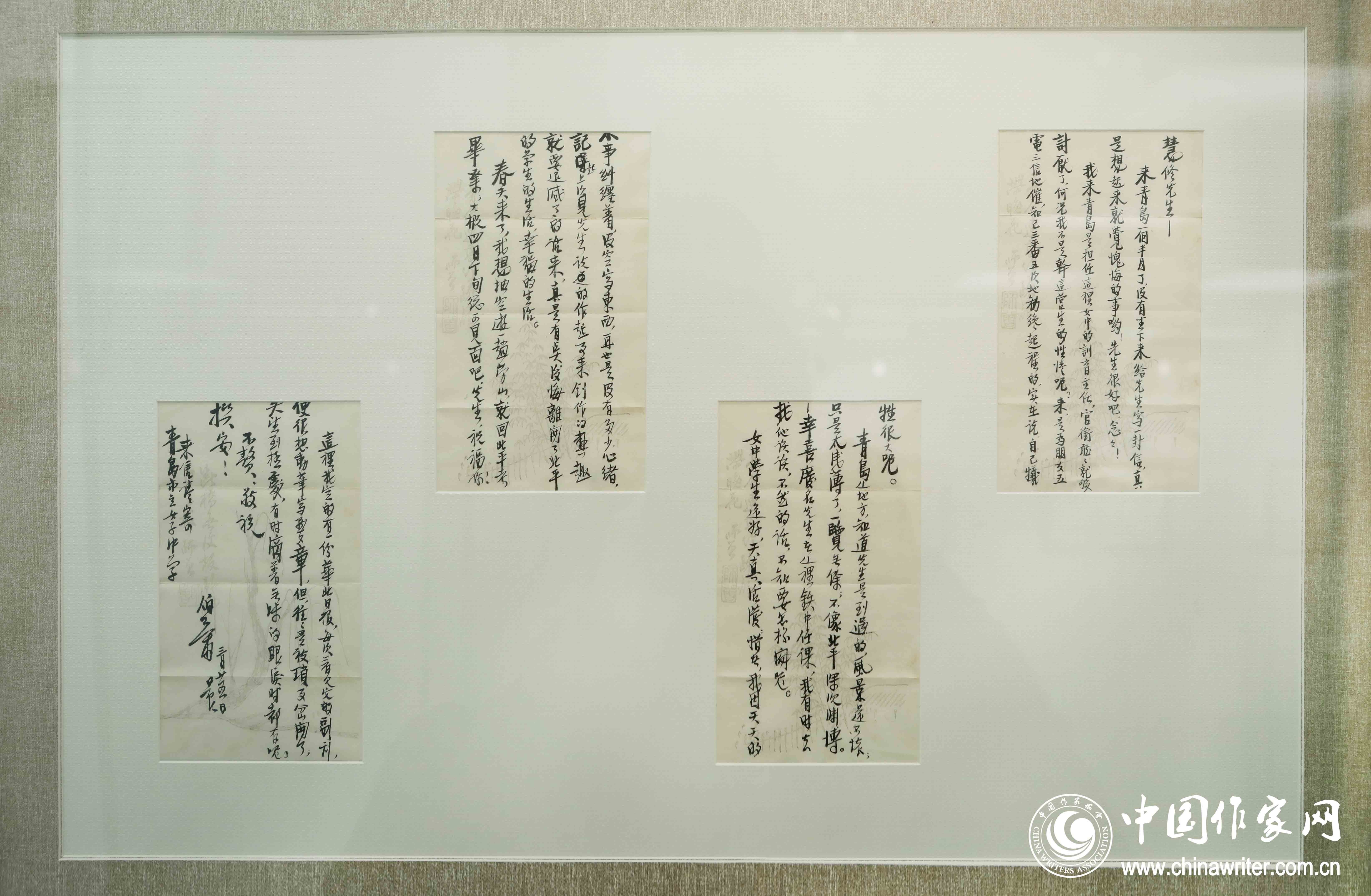 上圖為展出的吳伯蕭1931年致楊晦的三封信。1931年吳伯蕭從北平到青島女子中學(xué)任訓(xùn)育主任,3月25日去信向楊晦傾訴自己的苦惱——瑣事纏身,無暇創(chuàng)作。10月15日信是感謝楊晦寄贈(zèng)第25期《沉鐘》雜志。12月22日信希望楊晦能補(bǔ)寄第27期《沉鐘》,所寄未收到也。