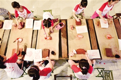 安徽合肥蜀山區(qū)半島新村社區(qū)的小朋友在體驗拓印技藝,感受傳統(tǒng)文化的魅力。葛宜年攝/光明圖片