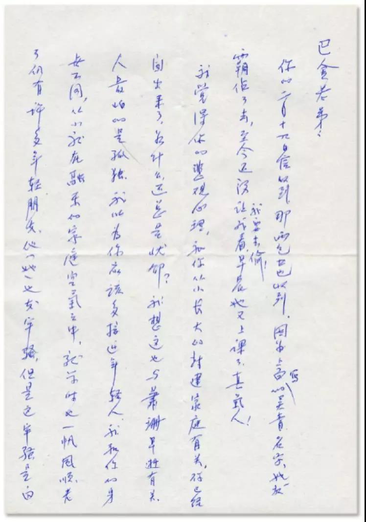 冰心耐心開導:“巴金老弟:……你已經(jīng)闖出來了,為什么還總是憂郁?我想這也與蕭珊早逝有關(guān),人最怕的是孤獨,我以為你應(yīng)該多接近年輕人,我和你的身世不同,從小就在融樂的家庭空氣之中,就學時也一帆風順,老了仍有許多年輕朋友?!改憧鞓?!”