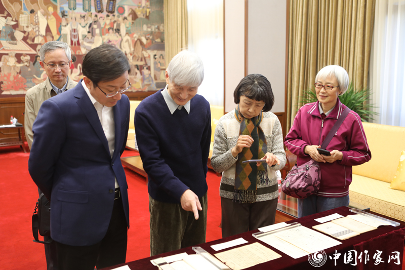 國家圖書館館長饒權(quán)(左二)與楊晦先生子女共同觀看楊晦先生手稿等珍貴文獻
